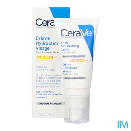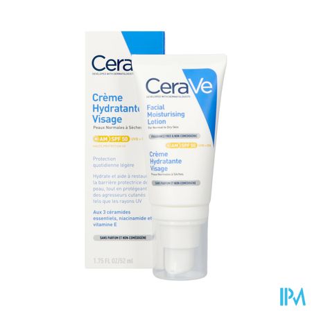 De hydraterende gezichtscrème met SPF50 van CeraVe is een veelzijdige dagcrème. Met drie essentiële ceramiden, hydraterend hyaluronzuur en verzachtende niacinamide maakt deze gezichtscrème ook gebruik van de gepatenteerde MVE technologie, om de huid gedurende de hele dag te voeden en te hydrateren. Deze gezichtscrème biedt ook een breedspectrum zonnebescherming aan met SPF50 en voorkomt aanhechting van vervuilende deeltjes. De gezichtscrème verdeelt zich homogeen over de huid, zonder witte strepen na te laten. Deze formule is niet-comedogeen, verstopt de poriën niet en is ideaal voor een normale tot droge huid en een zeer droge huid bij acne-behandeling.